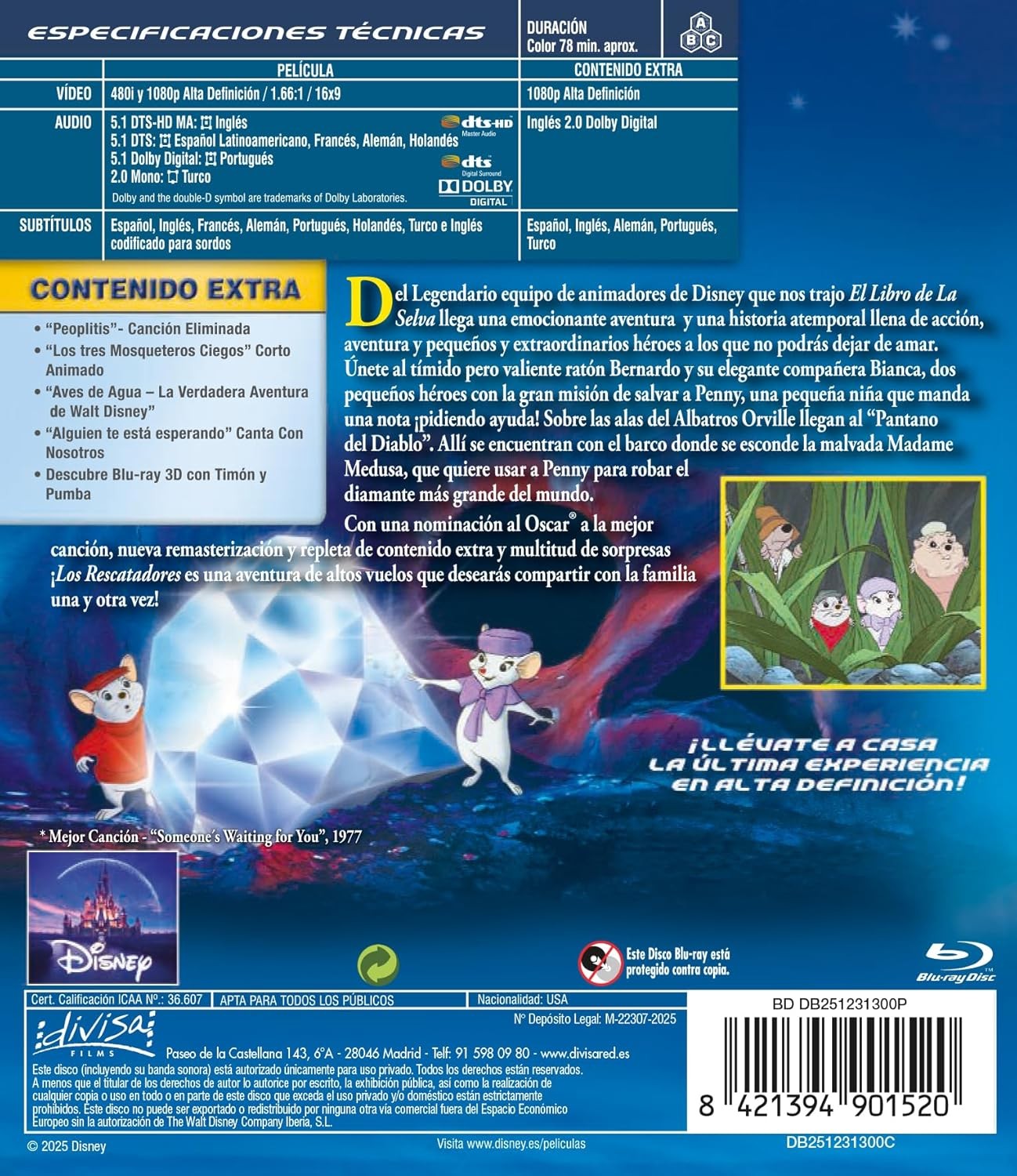 https://dvdstorespain.es/es/preventa/127860-los-rescatadores-the-rescuers-1977-blu-ray-blu-ray-2025--8421394901520.html127860Los Rescatadores [Blu-ray] (1977) The RescuersUna niña huérfana que ha sido secuestrada envía una nota dentro de una botella pidiendo ayuda. Bernardo y Bianca, dos valientes ratones, miembros de la Sociedad Internacional de Rescate, reciben el mensaje que los llevará al peligroso "Pantano del Diablo". Allí, ayudados por la libélula Evinrude y los habitantes del pantano, vivirán un sinfín de emocionantes aventuras luchando contra la malvada Madame Medusa. https://dvdstorespain.es/1100037-home_default/los-rescatadores-the-rescuers-1977-blu-ray-blu-ray-2025-.jpg10.7025instockDivisa HV - Disney10.702510.7025002025-11-12T09:47:59+0100/Inicio/Inicio/Blu-ray/Inicio/Películas/Inicio/Preventa
