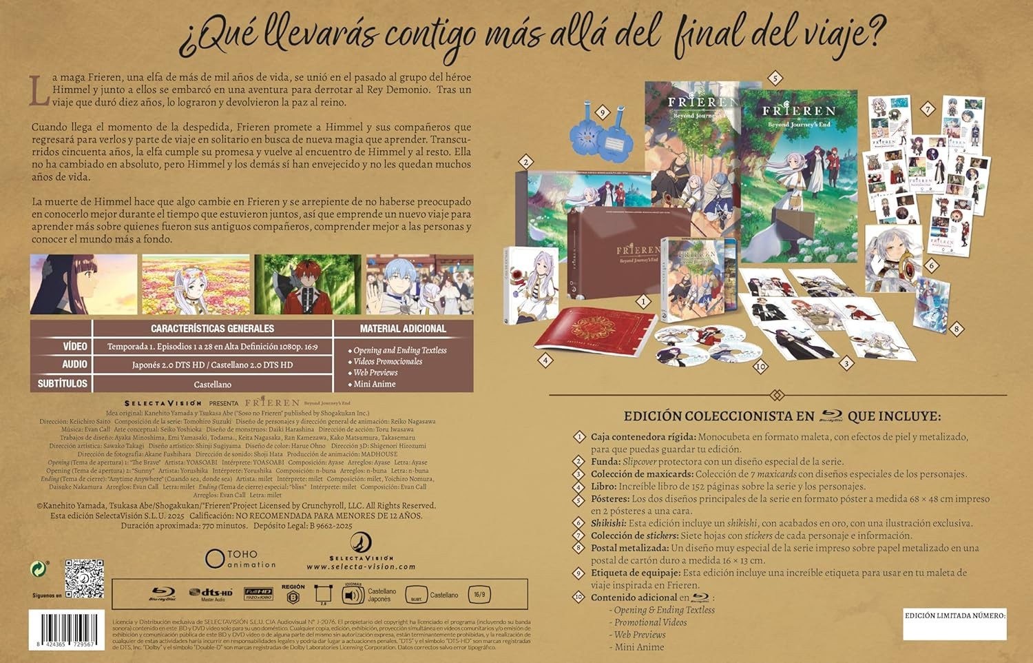 https://dvdstorespain.es/es/preventa/127930-frieren-temporada-1-episodios-1-a-28-blu-ray-coleccionista-blu-ray-2025--8424365729567.html127930Frieren (Episodios 1 a 28, Edición Coleccionista, 4 discos) [Blu-ray] (2023) Sōsō no FrierenSerie de TV (2023-2026). 2 temporadas. 38 episodios. La maga elfa Frieren y sus compañeros han derrotado al Rey Demonio, y traído la paz al mundo. Pero el tiempo pasa, y Frieren ve como sus compañeros humanos van falleciendo mientras ella sigue igual debido a su longevidad élfica. ¿Cómo entender la vida y la muerte que le rodea cuando ella tiene una esperanza de vida tan larga? Con los funerales de sus antiguos compañeros, Frieren decide cumplir los últimos deseos de sus compañeros y así empieza un nuevo viaje, y una nueva aventura...https://dvdstorespain.es/1101877-home_default/frieren-temporada-1-episodios-1-a-28-blu-ray-coleccionista-blu-ray-2025-.jpg95.7851instockSELECTA VISION95.785195.7851002025-11-19T21:45:04+0100/Inicio/Inicio/Blu-ray/Inicio/Series de TV/Inicio/Preventa