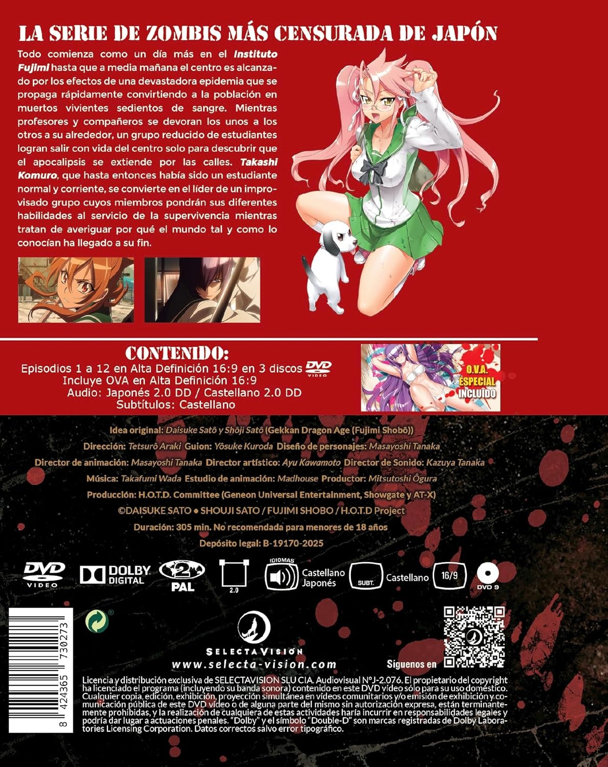 https://dvdstorespain.es/es/preventa/127932-high-school-of-the-dead-episodios-1-a-12-1-ova-dvd-2025--8424365730273.html127932High School Of The Dead (Episodios 1 al 12 y OVA, 3 discos) [DVD] (2010) Gakuen MokushirokuSerie de TV (2010). 12 episodios. El mundo ha sido tomado por una enfermedad mortal que transforma a los humanos en zombies. Los que antes eran amigos ahora son presa de aquellos que sucumbieron en la infección. Ahora un grupo de estudiantes y la enfermera de la escuela, se unen para sobrevivir al apocalipsis frente a sus ojos. Acción cargada de mucho gore y erotismo. https://dvdstorespain.es/1101884-home_default/high-school-of-the-dead-episodios-1-a-12-1-ova-dvd-2025-.jpg23.1405instockSELECTA VISION23.140523.1405002025-11-19T21:45:20+0100/Preventa