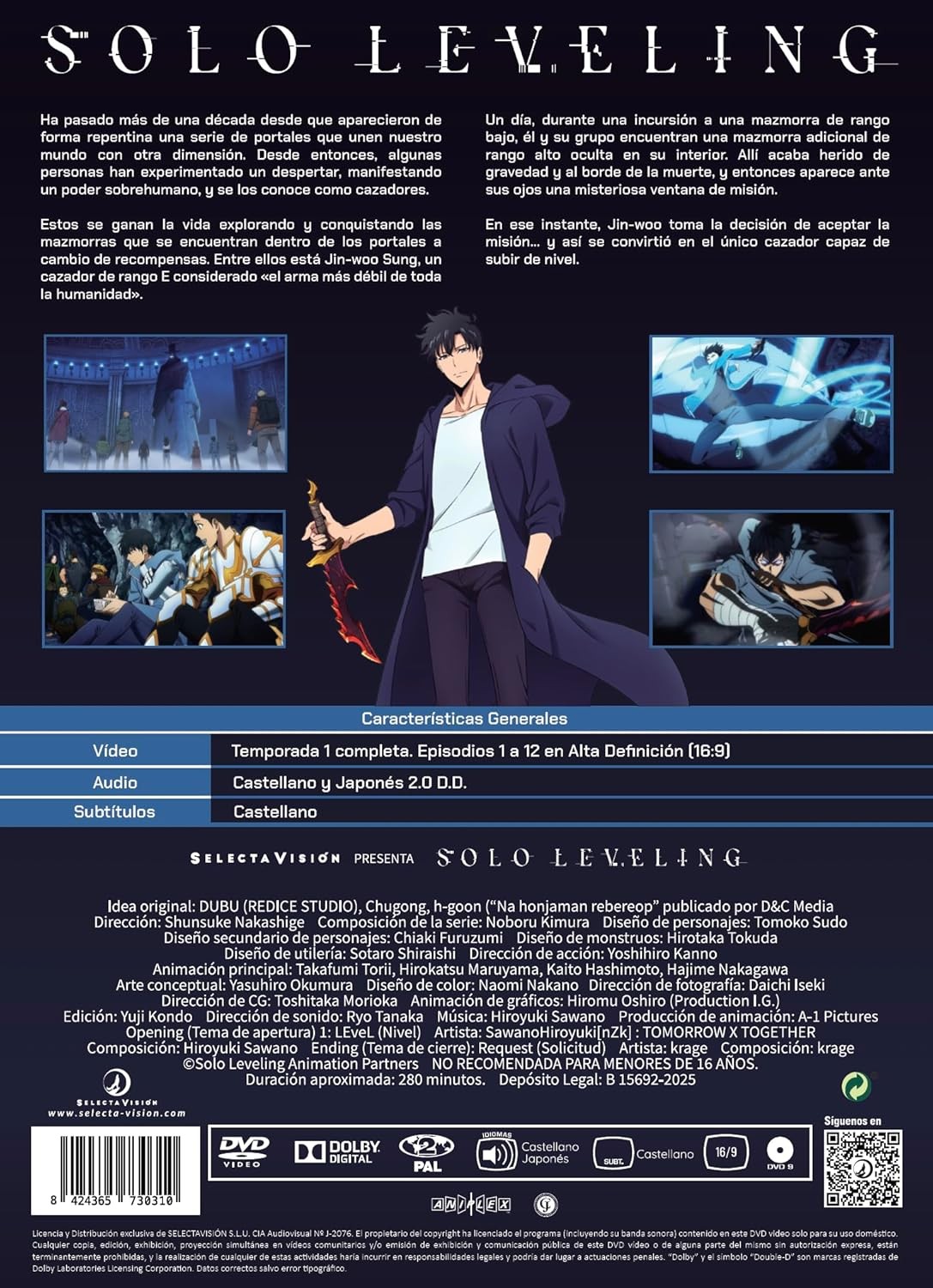 https://dvdstorespain.es/es/preventa/127934-solo-leveling-temporada-1-episodios-1-a-12-dvd-2025--8424365730310.html127934Solo Leveling (Episodios 1 al 12, 3 discos) [DVD] (2024)Serie de TV (2024 - 2025) 2 temporadas. 25 episodios. Ha pasado más de una década desde la repentina aparición de las 'puertas', los caminos que conectan nuestro mundo con una dimensión diferente. Desde entonces, ciertos humanos han despertado poderes sobrenaturales. A estos individuos se les llama 'cazadores'. Los cazadores se ganan la vida utilizando sus poderes para conquistar mazmorras dentro de las puertas. En este mundo de duros clientes, el cazador de bajo rango Jinwoo Sung es conocido como 'el cazador más débil de toda la humanidad'. Un día, Jinwoo resulta herido de muerte al toparse con mazmorras dobles de alto rango ocultas dentro de una mazmorra de bajo rango. Justo entonces, aparece ante él una misteriosa ventana de búsqueda. Al borde de la muerte, Jinwoo decide aceptar la misión y empieza a subir de nivel... mientras los demás no lo hacen.https://dvdstorespain.es/1101888-home_default/solo-leveling-temporada-1-episodios-1-a-12-dvd-2025-.jpg23.1405instockSELECTA VISION23.140523.1405002025-11-19T21:45:35+0100/Preventa