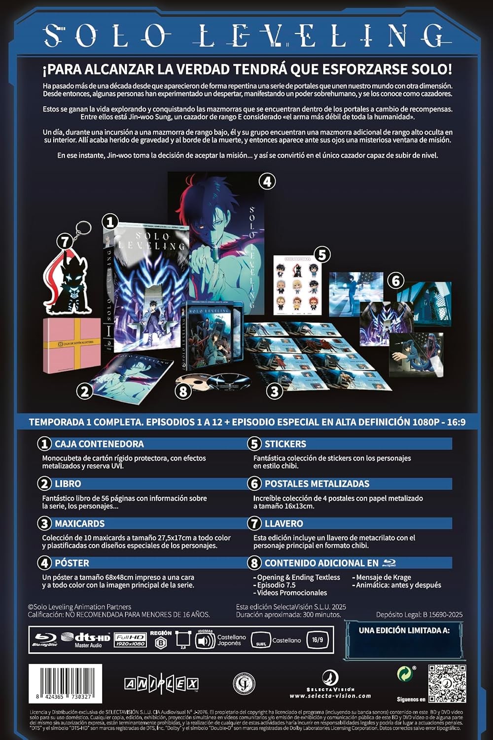 https://dvdstorespain.es/es/preventa/127935-solo-leveling-temporada-1-episodios-1-a-12-blu-ray-coleccionista-blu-ray-2025--8424365730327.html127935Solo Leveling (Episodios 1 a 12, Edición Coleccionistas A4, 2 discos) [Blu-ray] (2024)Serie de TV (2024 - 2025) 2 temporadas. 25 episodios. Ha pasado más de una década desde la repentina aparición de las 'puertas', los caminos que conectan nuestro mundo con una dimensión diferente. Desde entonces, ciertos humanos han despertado poderes sobrenaturales. A estos individuos se les llama 'cazadores'. Los cazadores se ganan la vida utilizando sus poderes para conquistar mazmorras dentro de las puertas. En este mundo de duros clientes, el cazador de bajo rango Jinwoo Sung es conocido como 'el cazador más débil de toda la humanidad'. Un día, Jinwoo resulta herido de muerte al toparse con mazmorras dobles de alto rango ocultas dentro de una mazmorra de bajo rango. Justo entonces, aparece ante él una misteriosa ventana de búsqueda. Al borde de la muerte, Jinwoo decide aceptar la misión y empieza a subir de nivel... mientras los demás no lo hacen.https://dvdstorespain.es/1101891-home_default/solo-leveling-temporada-1-episodios-1-a-12-blu-ray-coleccionista-blu-ray-2025-.jpg70.9917instockSELECTA VISION70.991770.9917002025-11-19T21:45:44+0100/Inicio/Inicio/Blu-ray/Inicio/Series de TV/Inicio/Preventa