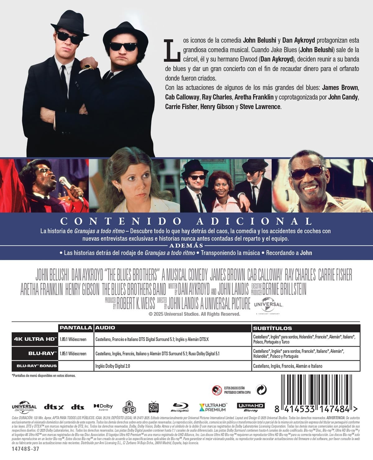 https://dvdstorespain.es/es/preventa/128050-granujas-a-todo-ritmo-4k-uhd-bd-bonus-edicion-metalica-blu-ray-2025--8414533147484.html128050Granujas A Todo Ritmo (Ed. Metálica) [4K UHD, Blu-ray] (1980) The Blues BrothersTras pasar años en la cárcel por robo a mano armada, Jake Blues es puesto en libertad por buen comportamiento. Sale de prisión vestido de la misma forma en la que entró: traje y sombrero negro y gafas oscuras. Vestido de idéntica manera, lo espera en la puerta de la prisión su hermano Elwood, que lo informa de que el orfanato de Santa Elena, el único hogar que conocieron, corre el peligro de desaparecer por razones económicas. Sin dudarlo ni un momento los hermanos se ponen manos a la obra.https://dvdstorespain.es/1104062-home_default/granujas-a-todo-ritmo-4k-uhd-bd-bonus-edicion-metalica-blu-ray-2025-.jpg27.1901instockARVI27.190127.1901002025-11-25T06:30:43+0100/Inicio/Inicio/Blu-ray/Inicio/Películas/Inicio/4K-UHD/Inicio/Preventa