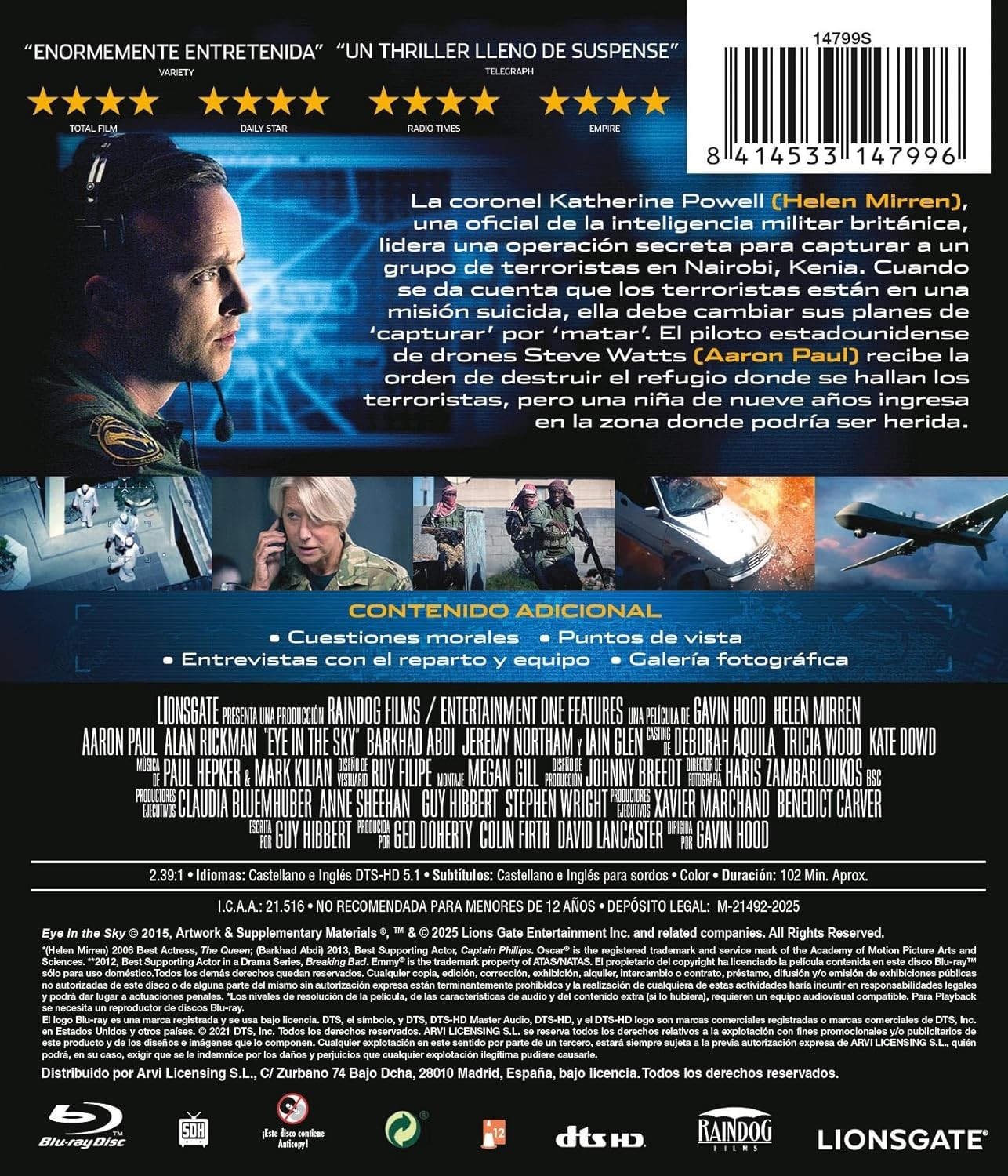https://dvdstorespain.es/es/preventa/128065-espias-desde-el-cielo-bd-blu-ray-2025--8414533147996.html128065Espías Desde El Cielo [Blu-ray] (2015) Eye in the SkyLa coronel Katherine Powell (Helen Mirren), una oficial de la inteligencia militar británica, lidera una operación secreta para capturar a un grupo de terroristas en Nairobi, Kenia. Cuando se da cuenta que los terroristas están en una misión suicida, ella debe cambiar sus planes de 'capturar' por 'matar'. El piloto estadounidense de drones Steve Watts (Aaron Paul) recibe la orden de destruir el refugio donde se hallan los terroristas, pero una niña de nueve años ingresa en la zona, donde podría ser una víctima más. https://dvdstorespain.es/1104091-home_default/espias-desde-el-cielo-bd-blu-ray-2025-.jpg11.7355instockARVI11.735511.7355002025-11-25T06:32:52+0100/Inicio/Inicio/Blu-ray/Inicio/Películas/Inicio/Preventa