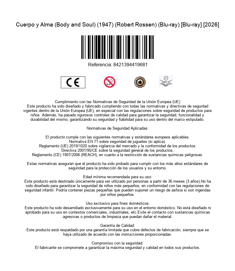 https://dvdstorespain.es/es/preventa/128214-cuerpo-y-alma-body-and-soul-1947-robert-rossen-blu-ray-blu-ray-2026--8421394419681.html128214Cuerpo y Alma [Blu-ray] (1947) Body and SoulCharlie Davis es un chico de familia humilde que aspira a conseguir la fama en el mundo del boxeo. Aunque su madre y su novia desaprueban su decisión, Charlie se asocia con Robert, un promotor de combates de boxeo, y va perdiendo los escrúpulos poco a poco, llegando a dejarse vencer en un combate amañado. https://dvdstorespain.es/1107650-home_default/cuerpo-y-alma-body-and-soul-1947-robert-rossen-blu-ray-blu-ray-2026-.jpg14.4628instockDivisa HV14.462814.4628002025-12-06T23:30:27+0100/Inicio/Inicio/Blu-ray/Inicio/Películas/Inicio/Preventa