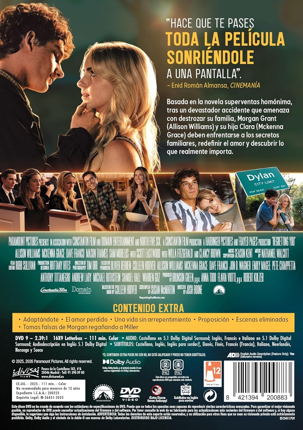 https://dvdstorespain.es/es/preventa/128495-a-pesar-de-ti-regretting-you-dvd-dvd-2026--8421394200883.html128495A Pesar de Ti [DVD] (2025) Regretting YouMorgan es una madre joven que intenta evitar que su hija Clara, de 16 años, cometa los mismos errores que ella, que se quedó embarazada y se casó demasiado joven, teniendo que aparcar sus propios sueños. La única persona que trae paz a la tensa relación madre-hija es Chris, su marido y padre de Clara. Pero esa paz se rompe cuando un trágico y extraño accidente trae desgarradoras consecuencias para ellas. Mientras lucha por reconstruir sus vidas, Morgan encuentra consuelo en la última persona que esperaba, mientras Clara se vuelve hacia el único chico que le han prohibido ver.https://dvdstorespain.es/1113558-home_default/a-pesar-de-ti-regretting-you-dvd-dvd-2026-.jpg15.7025instock15.702515.7025002025-12-24T01:30:49+0100/Inicio/Inicio/DVD/Inicio/Películas/Inicio/Preventa