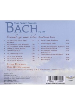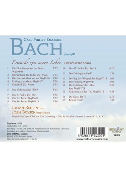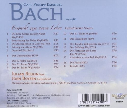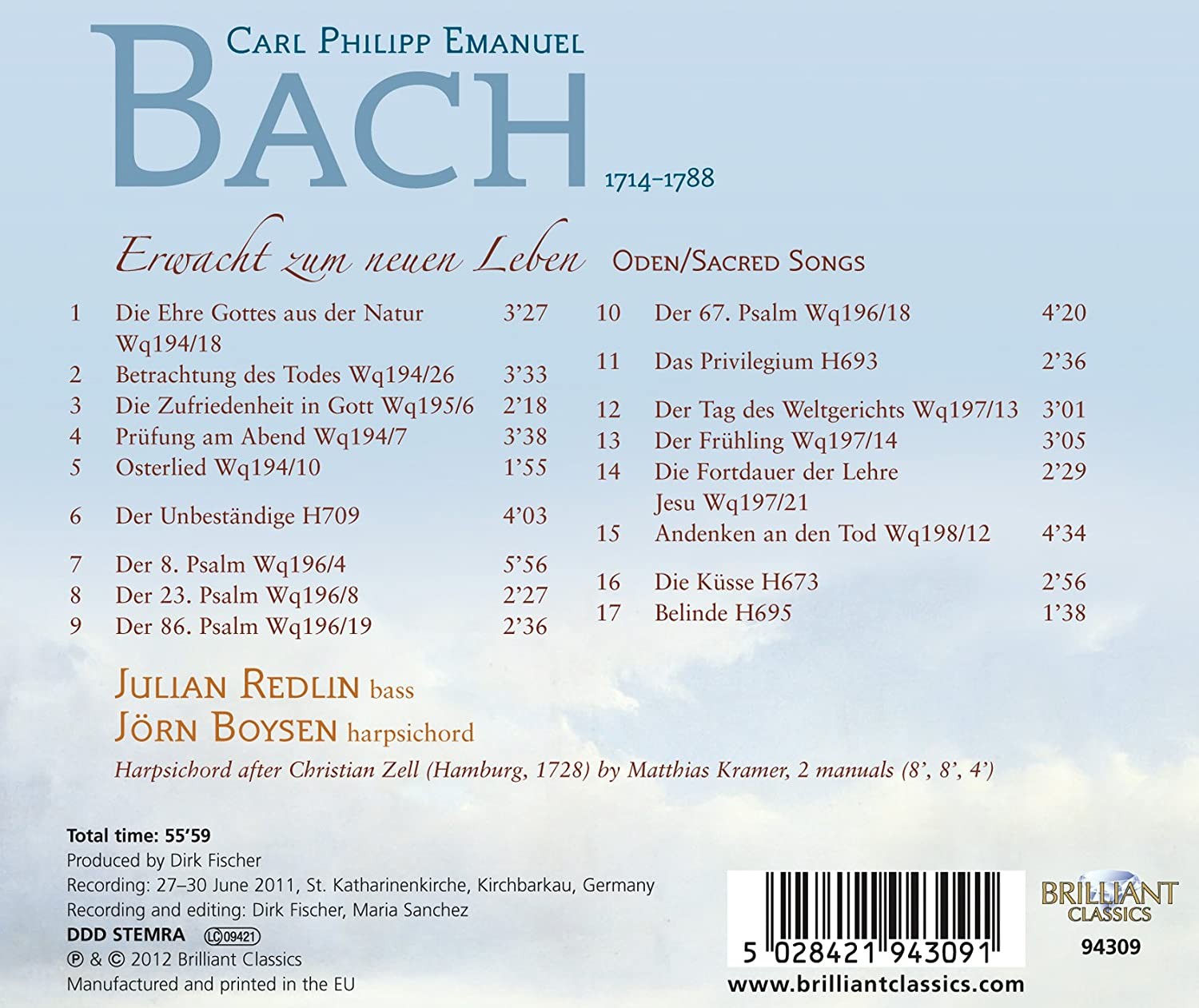 Odi e liriche sacre Wq 194, 196-198, 673, 693, 695, H 709 - Affascinante panorama dei vari stili impiegati da Carl Philip Emanuel, le Odi contengono un insieme di testi strofici profani e sacri, in una combinazione di arie e recitativi accompagnati dal basso continuo, lo sviluppo di una cantabilità barocca verso le esplosioni romantiche e un preludio al Lied.Jörn Boysen, clavicembalo