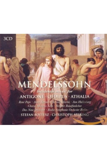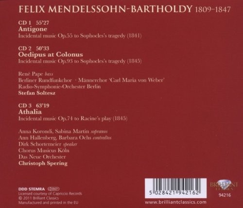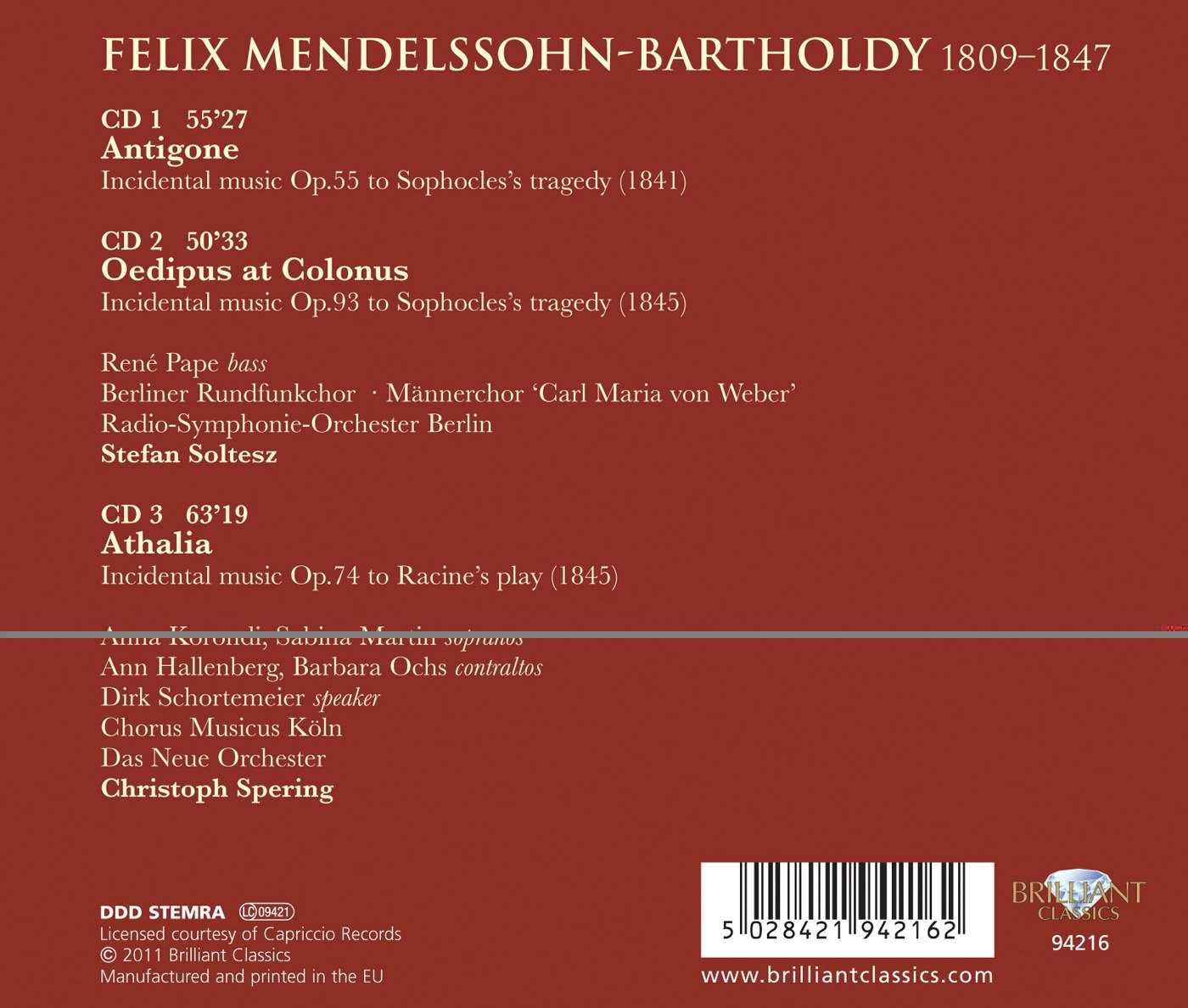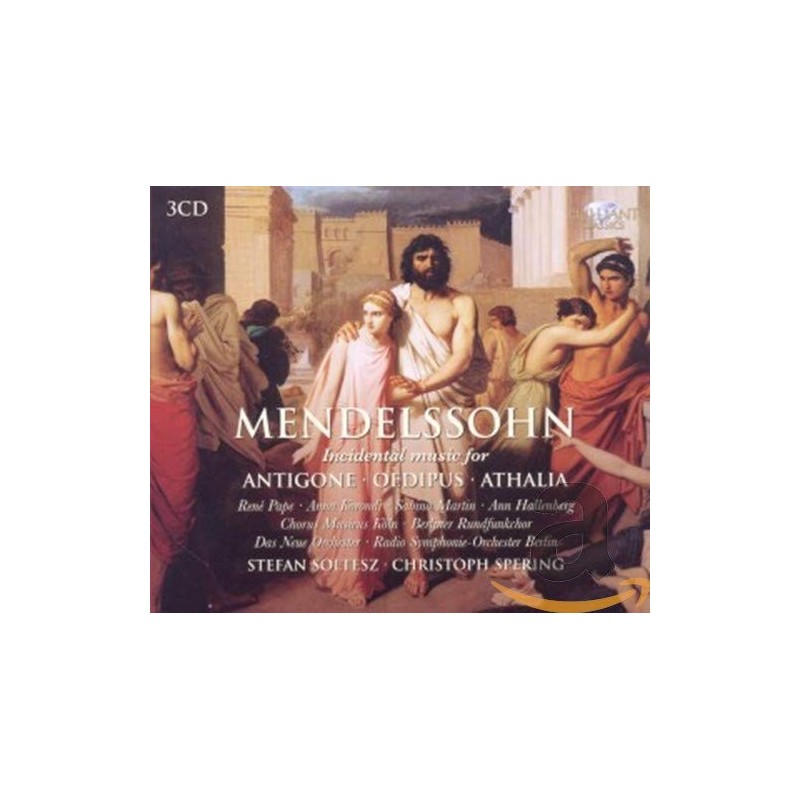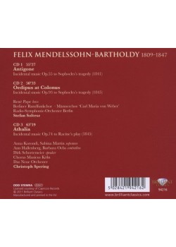 Felix Mendelssohn está asociado con una brillante partitura de música incidental para el teatro A Midsummer Nights Dream, pero de hecho compuso partituras para nada menos que 15 obras de teatro. Los más significativos de ellos, incluyendo las tres obras de este conjunto, datan del período en que fue empleado por el rey Federico Guillermo IV de Prusia, quien estaba fuertemente atraído por el espíritu del romanticismo y la cultura de la antigüedad griega. Mendelssohn se sintió atraído por la tragedia de Sófocles Antígona por su fuerte sentido dramático y sus temas universales, en particular el patetismo y el heroísmo de Antígona. Además de establecer varios de los coros, compuso interludios y música de fondo para discursos y diálogos. Su partitura altamente efectiva es intensamente noble y romántica, pero también sensible al verso. Su música para la tragedia de Sófocles Oedipus at Colonus se aleja aún más de la forma dramática ateniense, con recitativo acompañado, solos y dúos para los personajes principales, y es más elaborada. Tiene una intensidad trágica que no se escucha a menudo en su música. Su partitura de música incidental para la obra religiosa de Racine Athalie es típica del estilo del compositor, caracterizado por una fluida e ininterrumpida invención melódica, una colorida orquestación y una imaginativa partitura para las voces. Muestra al compositor en la cima de sus poderes tanto como dramaturgo musical como poeta orquestal.