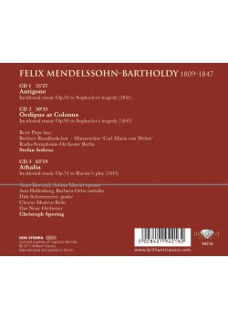 Felix Mendelssohn is associated with one brilliant score of incidental music for the theatre A Midsummer Nights Dream but in fact he composed scores for no less than 15 stage works.The most significant of them, including the three works in this set, date from the period when he was employed by King Frederick William IV of Prussia, who was strongly attracted to the spirit of Romanticism and the culture of Greek antiquity. Mendelssohn was drawn to Sophocless tragedy Antigone by its strong dramatic sense and its universal themes, particularly Antigones pathos and heroism. In addition to setting several of the choruses, he composed interludes and background music for speeches and dialogues. His highly effective score is intensely noble and romantic yet also sensitive to the verse. His music for Sophocless Oedipus at Colonus moves further away from Athenian dramatic form, with accompanied recitative, solos and duets for the principal characters, and is more elaborate. It has a tragic intensity not often heard in his music. His score of incidental music for Racines religious drama Athalie is typical of the composers style characterised by flowing, sustained melodic invention, colourful orchestration and imaginative scoring for the voices. It displays the composer at the height of his powers both as a musical dramatist and an orchestral tone-poet.