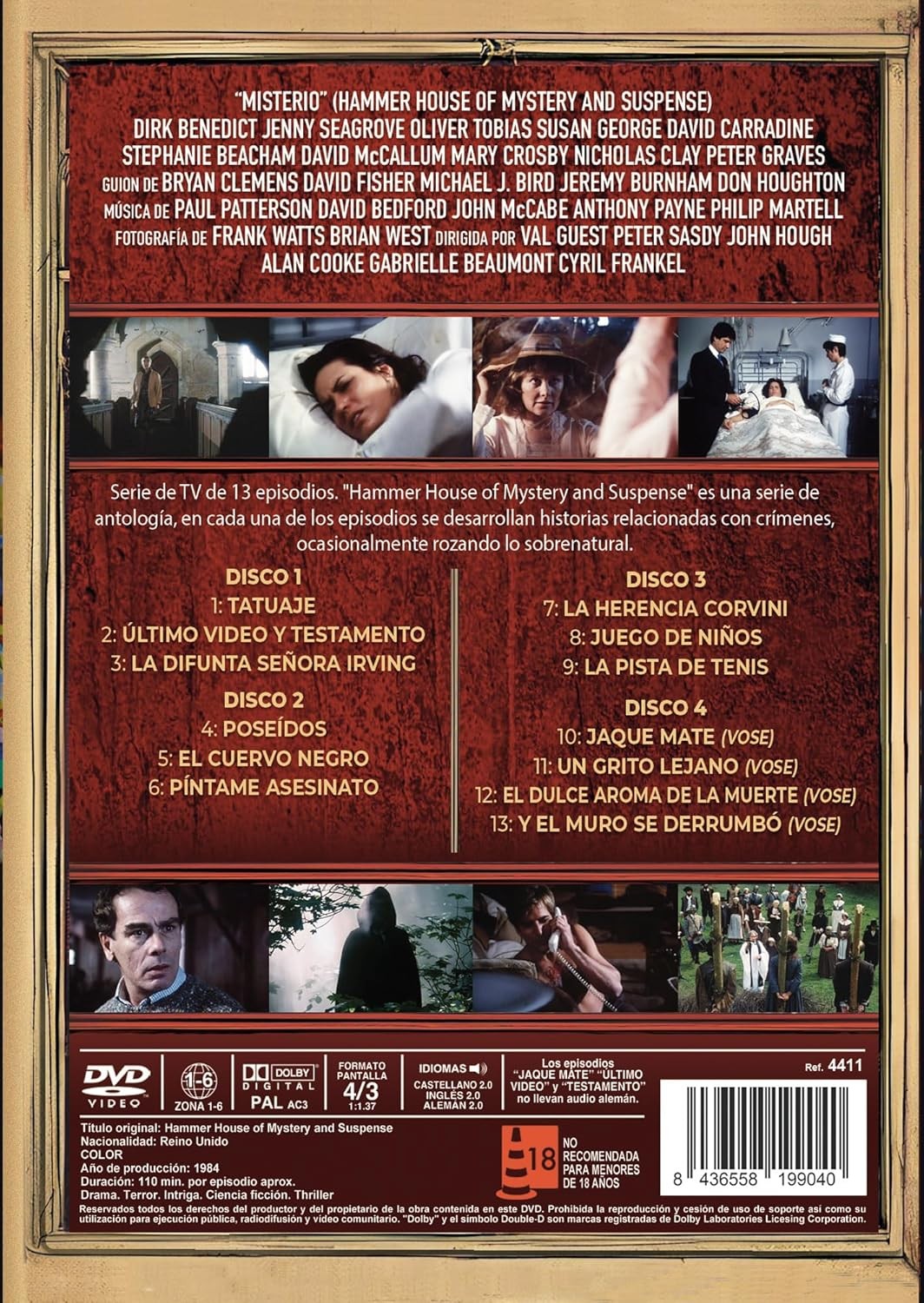 Serie de TV de 13 episodios. "Hammer House of Mystery and Suspense" es una serie de antología, de los mismos creadores que "Hammer House of Horror". Idiomas: Castellano (Dolby Digital 2.0), Inglés (Dolby Digital 2.0), Alemán (Dolby Digital 2.0). Extras: Los episodios JAQUE MATE y ÚLTIMO VIDEO Y TESTAMENTO no llevan audio alemán