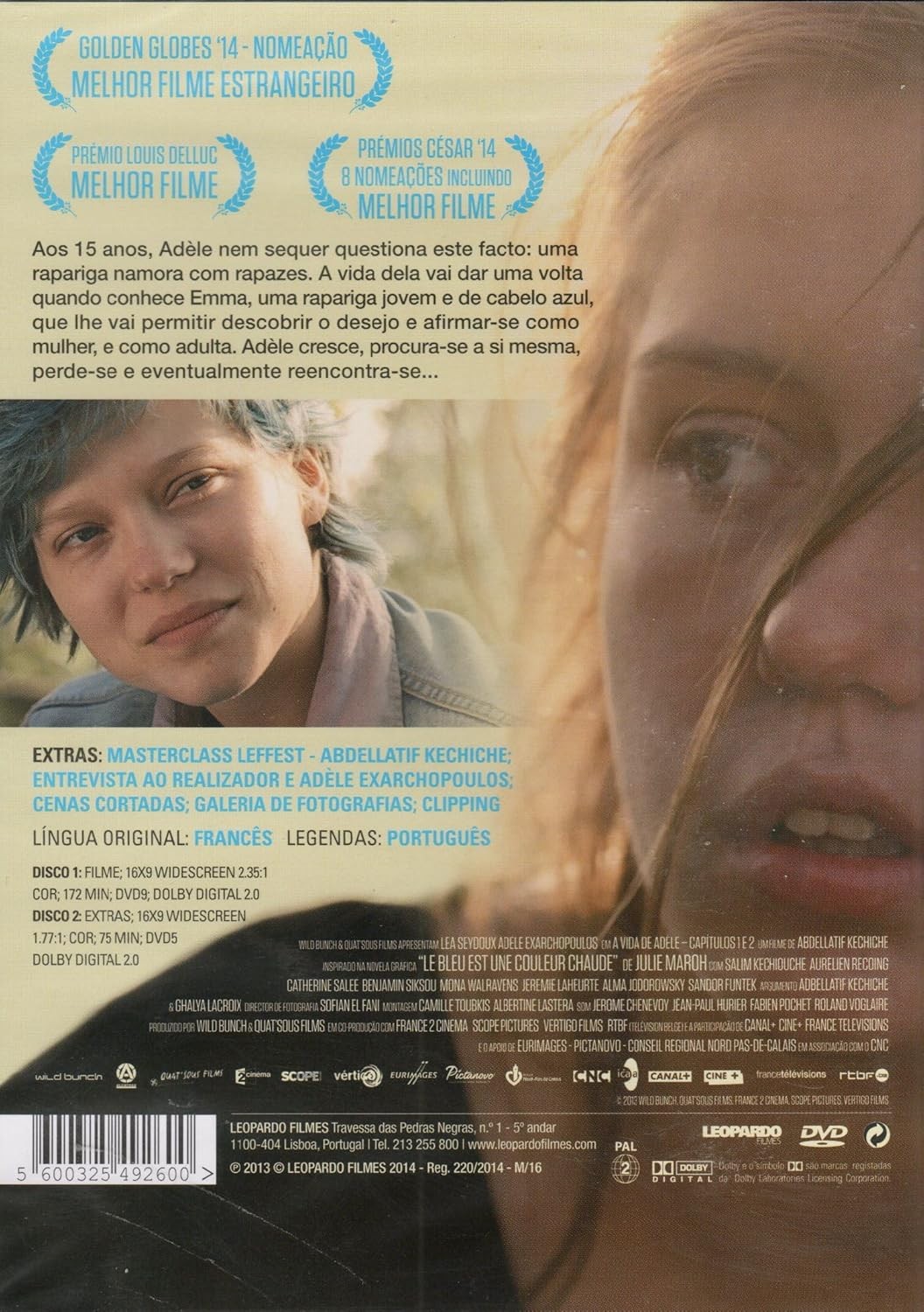 Descubre 'A Vida de Adèle', la aclamada película ganadora de la Palma de Oro en el Festival de Cannes. Esta edición en DVD de Leopardo Filmes incluye los Capítulos 1 y 2 de esta cautivadora historia. Con audio original en francés y subtítulos en portugués, la película se presenta en formato widescreen 16:9 con una calidad de imagen 2.35:1. El DVD contiene 172 minutos de contenido principal con sonido Dolby Digital 2.0. Como bonus, incluye un segundo disco con 75 minutos de contenido extra, incluyendo una masterclass de Abdellatif Kechiche, entrevistas, escenas eliminadas, galería de fotografías y más material adicional. Esta película, nominada al Globo de Oro como Mejor Película Extranjera y ganadora del Premio Louis Delluc, también recibió 8 nominaciones en los Premios César. Una obra cinematográfica imprescindible que explora temas de autodescubrimiento y crecimiento personal con una narrativa profunda y conmovedora.