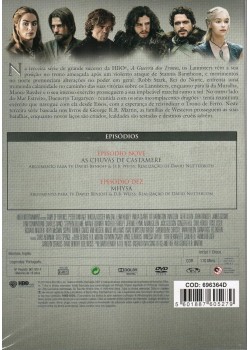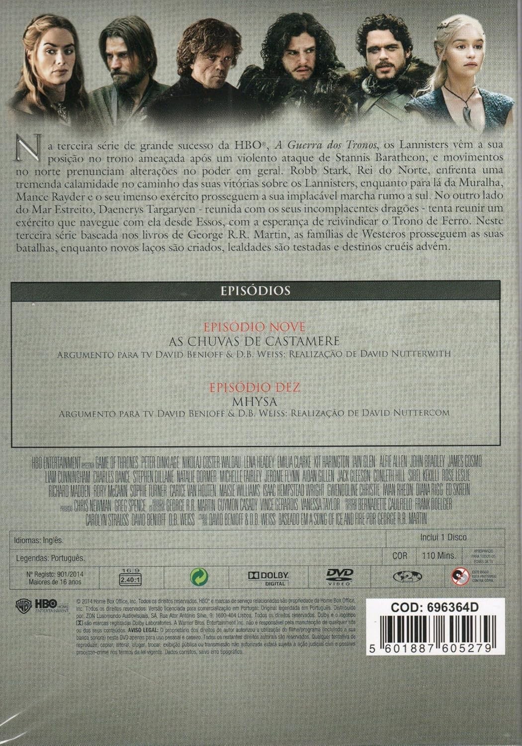 Sumérgete en la épica saga de HBO con el Disco 5 de la Tercera Temporada de 'A Guerra dos Tronos'. Este DVD contiene los episodios culminantes 9 y 10 de la temporada: 'As Chuvas de Castamere' y 'Mhysa', dirigidos por David Nutter. Con audio en inglés y subtítulos en portugués, estos episodios fundamentales presentan momentos decisivos en la lucha por el Trono de Hierro. Los Lannister consolidan su poder, mientras que en el Norte, la situación se torna más compleja. Al otro lado del Mar Estrecho, una nueva fuerza emerge con determinación. Con una duración aproximada de 110 minutos, este disco ofrece la calidad audiovisual característica de HBO, presentada en formato 2.40:1 con sonido Dolby Digital. Clasificado para mayores de 16 años, este DVD es parte esencial de la colección de cualquier seguidor de la serie, capturando momentos cruciales que han definido la narrativa de esta aclamada producción televisiva.