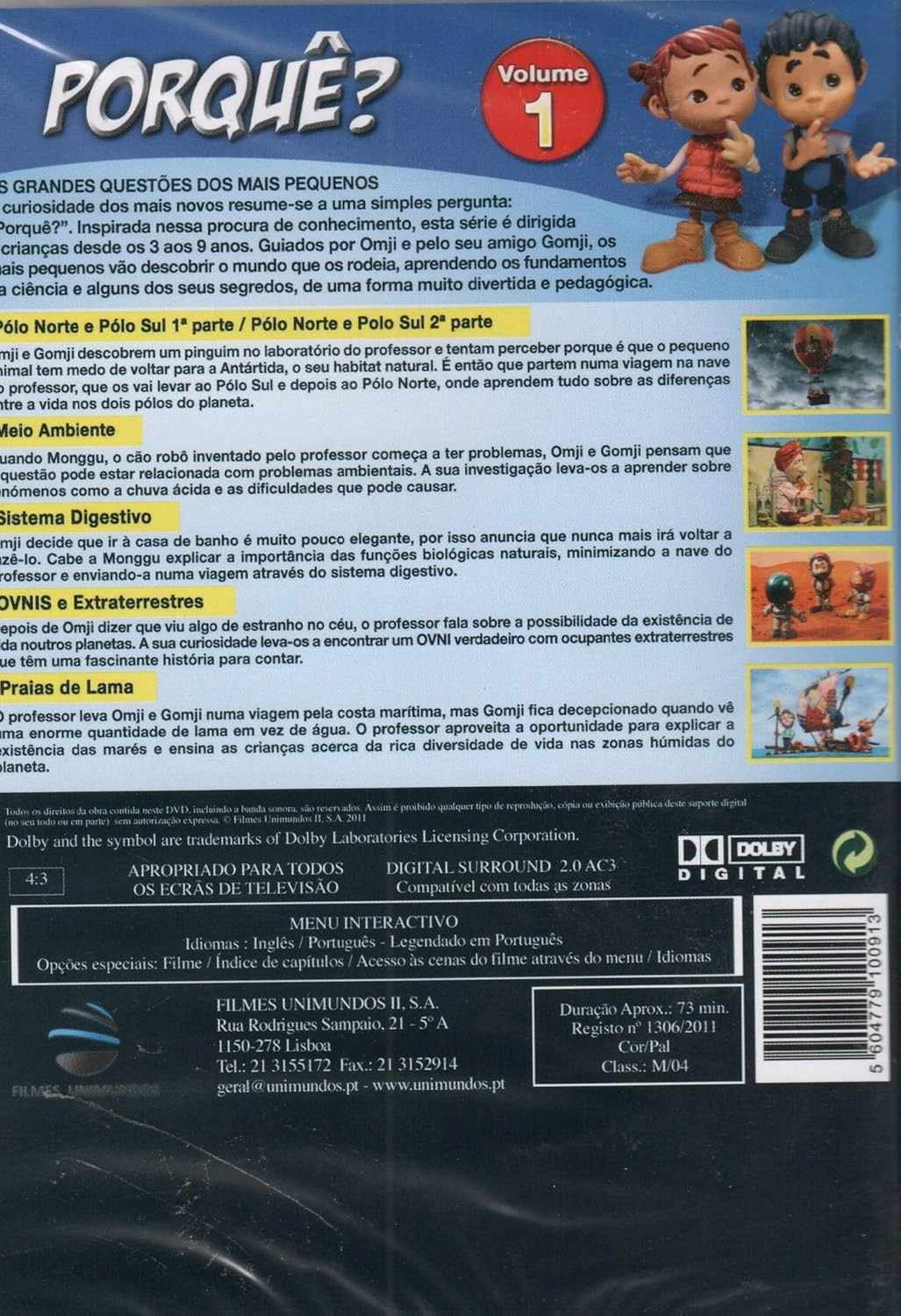 ¡Descubre la ciencia de una manera divertida con 'Porquê?' Volumen 1! Este fascinante DVD educativo está diseñado especialmente para niños de 3 a 9 años, combinando animación stop-motion y gráficos 3D para crear una experiencia de aprendizaje cautivadora. A través de episodios emocionantes, los pequeños explorarán temas científicos fundamentales como el Polo Norte y Polo Sur, el medio ambiente, el sistema digestivo, OVNIs y extraterrestres, y las playas. Con una duración aproximada de 73 minutos, este DVD interactivo incluye opciones de audio en portugués e inglés, con subtítulos en portugués. Compatible con todas las zonas de reproducción y equipado con sonido envolvente digital 2.0 AC3, este programa educativo transforma las preguntas curiosas de los niños en aventuras de aprendizaje memorables. El menú interactivo facilita la navegación entre capítulos, permitiendo una experiencia educativa personalizada.