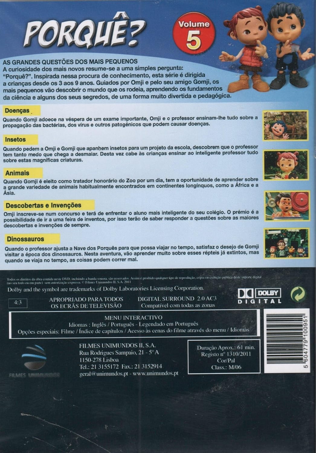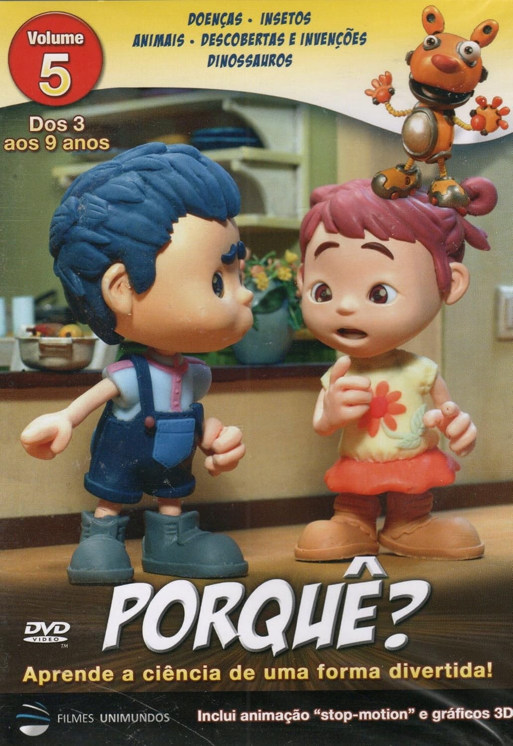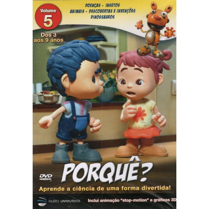 Descubre el fascinante mundo de la ciencia con '¿Porqué?' Volumen 5, un DVD educativo diseñado para niños de 3 a 9 años. Esta serie animada combina el entretenimiento con el aprendizaje, utilizando animación stop-motion y gráficos 3D de alta calidad. El DVD incluye cinco episodios emocionantes que exploran temas diversos como enfermedades, insectos, animales, descubrimientos e invenciones, y dinosaurios. Con una duración aproximada de 61 minutos, este DVD interactivo incluye opciones de audio en inglés y portugués, con subtítulos en portugués. El menú interactivo permite un fácil acceso a las escenas y capítulos. Producido por Filmes Unimundos, este DVD educativo utiliza personajes carismáticos para guiar a los pequeños en su viaje de descubrimiento, haciendo que el aprendizaje sea una experiencia divertida y memorable. Compatible con todas las zonas, incluye sonido Dolby Digital Surround 2.0 AC3 para una experiencia audiovisual inmersiva.