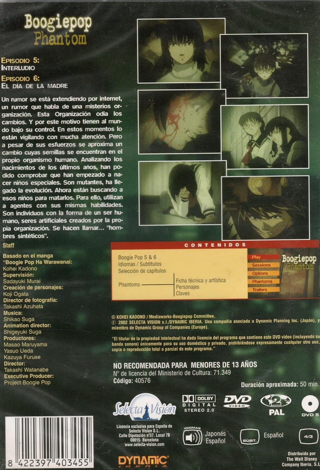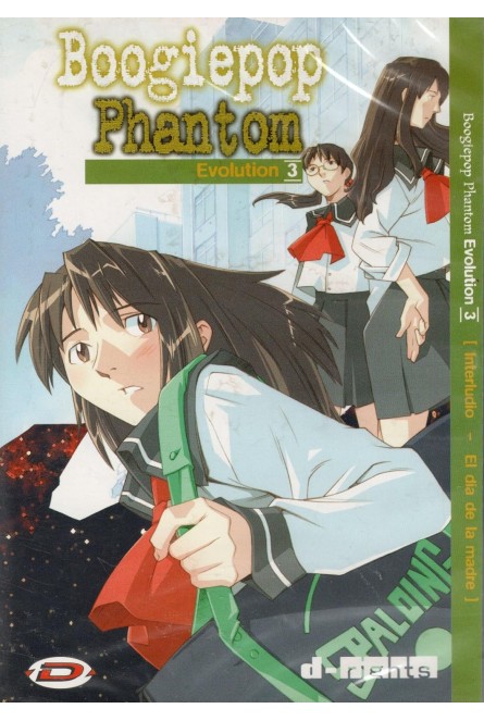 Boogiepop Phantom: Evolution 3 presenta los episodios 5 (Interludio) y 6 (El día de la madre) de esta fascinante serie de anime. La trama gira en torno a una misteriosa organización que vigila cambios en la humanidad, específicamente el surgimiento de niños con habilidades especiales. Este DVD, distribuido por Dynamic, ofrece aproximadamente 50 minutos de contenido en formato PAL con audio en japonés y español, además de subtítulos en español. El disco incluye características adicionales como selección de capítulos, ficha técnica y artística, y acceso a trailers. Basado en el manga 'Boogie Pop Ha Warawanai' de Kohei Kadono, esta producción cuenta con la dirección de Takashi Watanabe y música de Shikao Suga. El contenido está clasificado para mayores de 13 años, presentando una narrativa intrigante que explora temas de evolución y supervivencia en un contexto sobrenatural.
