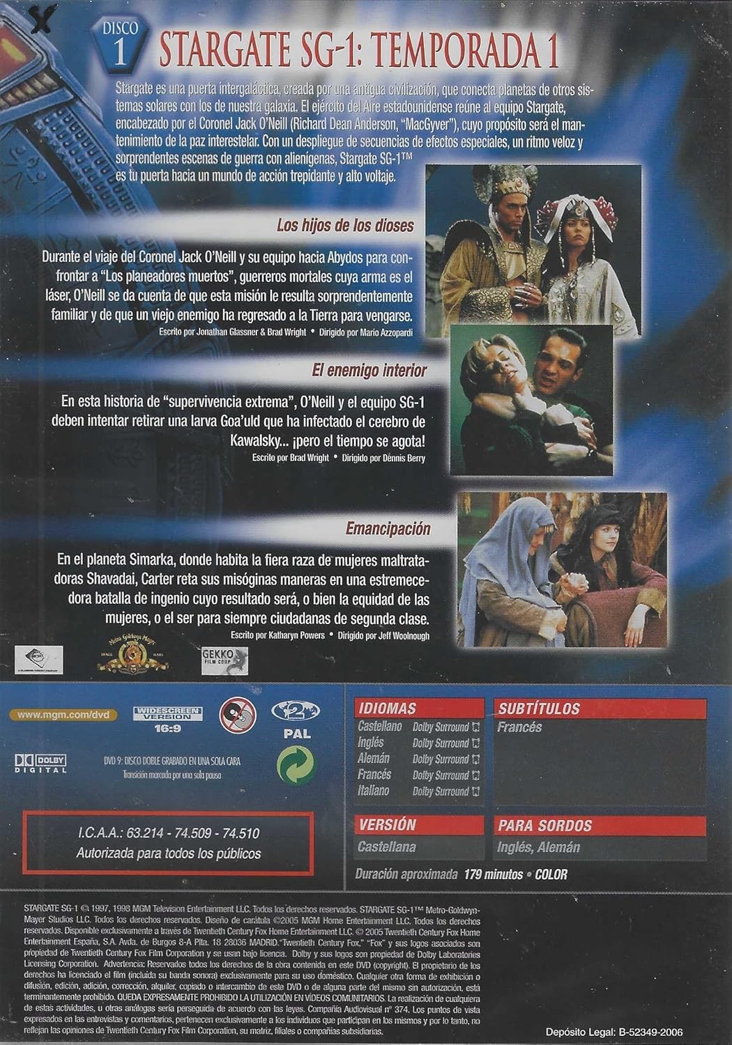 Sumérgete en la primera temporada de Stargate SG-1, la aclamada serie de ciencia ficción de MGM. Este DVD contiene episodios fundamentales que establecen las bases de una épica aventura intergaláctica. Incluye tres episodios cautivadores: 'Los hijos de los dioses', donde el equipo SG-1 viaja a Abydos para enfrentar una amenaza inesperada; 'El enemigo interior', una intensa historia de supervivencia contra una peligrosa larva Goa'uld; y 'Emancipación', que explora temas de igualdad en un planeta alienígena. Con audio en varios idiomas incluyendo castellano, inglés, alemán, francés e italiano, todos en Dolby Surround, y subtítulos correspondientes. La duración aproximada es de 179 minutos, presentado en formato PAL y color. Este disco forma parte de una colección imprescindible para los amantes de la ciencia ficción, ofreciendo efectos especiales de alta calidad y una narrativa envolvente que ha cautivado a audiencias globales.