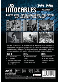Serie de TV (1959-1963). 4 temporadas. 119 episodios. Eliot Ness (Robert Stack), un personaje real, fue la pesadilla de los gángsteres de Chicago durante la época de la Ley Seca (1920-1933). Se hizo famoso sobre todo porque consiguió arrestar a Al Capone. Pero Ness y sus hombres, "los Intocables", también se enfrentaron a criminales de la catadura de Dutch Schultz, Lucky Luciano o Ma Barker.