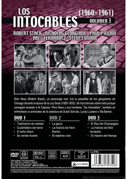 Serie de TV (1959-1963). 4 temporadas. 119 episodios. Eliot Ness (Robert Stack), un personaje real, fue la pesadilla de los gángsteres de Chicago durante la época de la Ley Seca (1920-1933). Se hizo famoso sobre todo porque consiguió arrestar a Al Capone. Pero Ness y sus hombres, "los Intocables", también se enfrentaron a criminales de la catadura de Dutch Schultz, Lucky Luciano o Ma Barker.