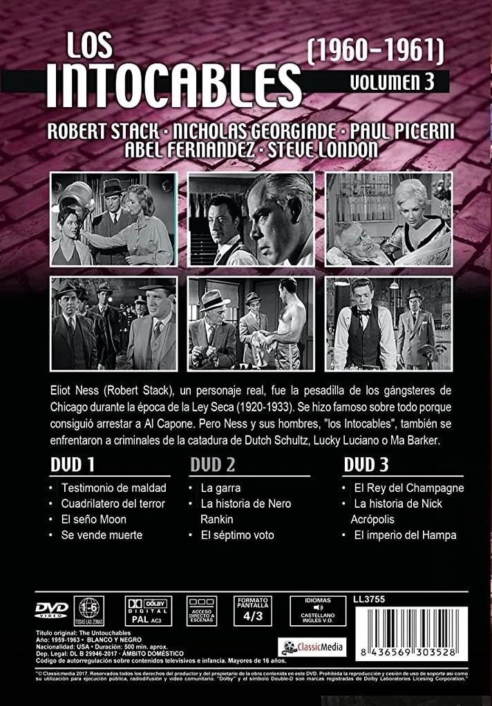 https://dvdstorespain.es/es/series-dvd-blu-ray/38419-los-intocables-1960-1961-vol-3-dvd--8436569303528.html38419Los Intocables (1960-1961, Volumen 3) [DVD] (1959) The UntouchablesSerie de TV (1959-1963). 4 temporadas. 119 episodios. Eliot Ness (Robert Stack), un personaje real, fue la pesadilla de los gángsteres de Chicago durante la época de la Ley Seca (1920-1933). Se hizo famoso sobre todo porque consiguió arrestar a Al Capone. Pero Ness y sus hombres, "los Intocables", también se enfrentaron a criminales de la catadura de Dutch Schultz, Lucky Luciano o Ma Barker. https://dvdstorespain.es/514411-home_default/los-intocables-1960-1961-vol-3-dvd-.jpg11.405instockLlamentol11.40511.405002017-12-30T15:44:51+0100/Inicio/Inicio/DVD/Inicio/Series de TV/Inicio/Nuevos/Inicio/VELADA SP 20/Inicio/VELADA DE 30/Inicio/VELADA FR 30/Inicio/VELADA IT 30