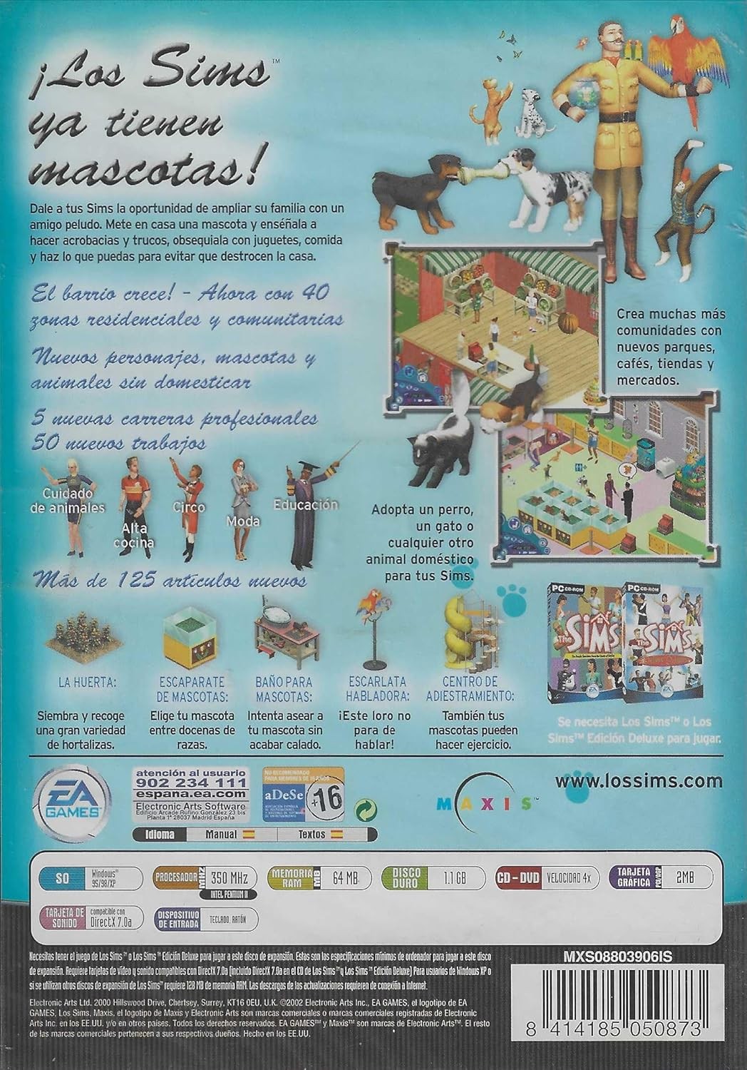 ¡Descubre una nueva dimensión en Los Sims con esta fascinante expansión 'Animales a Raudales'! Este disco de expansión en castellano te permite ampliar la experiencia de juego añadiendo mascotas a tus familias virtuales. Incluye 40 nuevas zonas residenciales y comunitarias, además de características innovadoras como la posibilidad de adoptar perros, gatos y otras mascotas. Enséñales trucos, cuídalos y evita que destruyan la casa mientras exploras 5 nuevas carreras profesionales y más de 125 objetos nuevos. El juego incluye nuevas instalaciones como el centro de adiestramiento, baño para mascotas y una huerta donde podrás sembrar y recoger diferentes variedades. Con gráficos mejorados y una jugabilidad ampliada, esta expansión añade elementos como tiendas de mascotas, parques y mercados para crear comunidades más dinámicas. Requiere el juego base Los Sims para funcionar. Compatible con PC, necesita 64 MB de RAM, procesador de 350 MHz y 1.1 GB de espacio en disco.